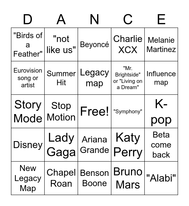 This bingo card has a free space and 24 words: New Legacy Map, Lady Gaga, Legacy map, Bruno Mars, Melanie Martinez, "Birds of a Feather", "not like us", Beyoncé, "Symphony", K-pop, Story Mode, Summer Hit, Katy Perry, Beta come back, Eurovision song or artist, Chapel Roan, Benson Boone, Charlie XCX, Influence map, Disney, Stop Motion, Ariana Grande, "Mr. Brightside" or "Living on a Dream" and "Alabi".