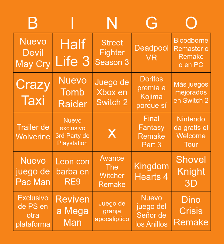 This bingo card has a free space and 24 words: Leon con barba en RE9, Reviven a Mega Man, Juego de Xbox en Switch 2, Exclusivo de PS en otra plataforma, Bloodborne Remaster o Remake o en PC, Nuevo Devil May Cry, Crazy Taxi, Half Life 3, Final Fantasy Remake Part 3, Avance The Witcher Remake, Doritos premia a Kojima porque sí, Trailer de Wolverine, Kingdom Hearts 4, Shovel Knight 3D, Nuevo Tomb Raider, Nuevo juego del Señor de los Anillos, Nintendo da gratis el Welcome Tour, Street Fighter Season 3, Más juegos mejorados en Switch 2, Nuevo exclusivo 3rd Party de Playstation, Dino Crisis Remake, Nuevo juego de Pac Man, Deadpool VR and Juego de granja apocaliptico.