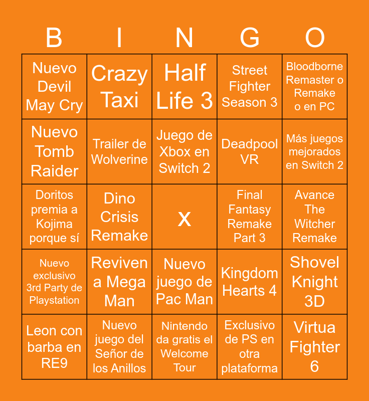 This bingo card has a free space and 24 words: Leon con barba en RE9, Reviven a Mega Man, Juego de Xbox en Switch 2, Exclusivo de PS en otra plataforma, Bloodborne Remaster o Remake o en PC, Nuevo Devil May Cry, Crazy Taxi, Half Life 3, Final Fantasy Remake Part 3, Avance The Witcher Remake, Doritos premia a Kojima porque sí, Trailer de Wolverine, Kingdom Hearts 4, Shovel Knight 3D, Nuevo Tomb Raider, Nuevo juego del Señor de los Anillos, Nintendo da gratis el Welcome Tour, Street Fighter Season 3, Más juegos mejorados en Switch 2, Nuevo exclusivo 3rd Party de Playstation, Dino Crisis Remake, Nuevo juego de Pac Man, Deadpool VR and Virtua Fighter 6.