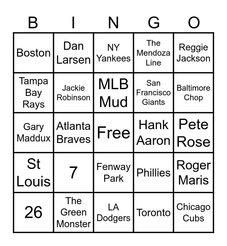 This bingo card has a free space and 29 words: 26, 2, Atlanta Braves, 73, Boston, NY Yankees, Jackie Robinson, 7, Hank Aaron, The Green Monster, Pete Rose, Chicago Cubs, LA Dodgers, Toronto, Baltimore Chop, 5, Fenway Park, St Louis, Reggie Jackson, Gary Maddux, Phillies, Golden Glove Award, San Francisco Giants, Tampa Bay Rays, The Mendoza Line, Dan Larsen, Roger Maris, MLB Mud and Oakland.