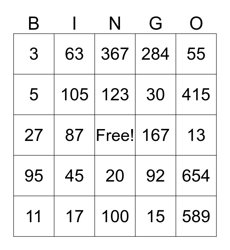 This bingo card has a free space and 24 words: 45, 17, 123, 11, 55, 3, 5, 63, 167, 20, 30, 27, 92, 654, 105, 15, 13, 367, 415, 87, 589, 95, 284 and 100.