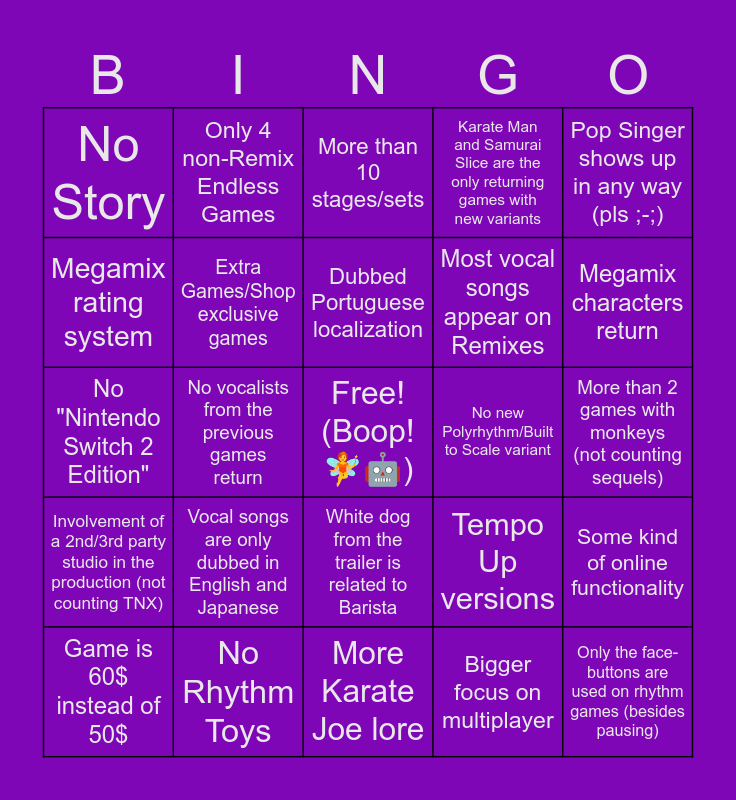 This bingo card has a free space and 24 words: Game is 60$ instead of 50$, Vocal songs are only dubbed in English and Japanese, Dubbed Portuguese localization, Bigger focus on multiplayer, Pop Singer shows up in any way (pls ;-;), No Story, Only 4 non-Remix Endless Games, More than 10 stages/sets, No new Polyrhythm/Built to Scale variant, More than 2 games with monkeys (not counting sequels), No "Nintendo Switch 2 Edition", Extra Games/Shop exclusive games, Tempo Up versions, Some kind of online functionality, Megamix rating system, No Rhythm Toys, More Karate Joe lore, Karate Man and Samurai Slice are the only returning games with new variants, Megamix characters return, Involvement of a 2nd/3rd party studio in the production (not counting TNX), No vocalists from the previous games return, White dog from the trailer is related to Barista, Most vocal songs appear on Remixes and Only the face-buttons are used on rhythm games (besides pausing).