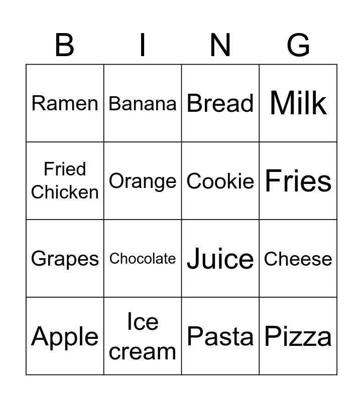 This bingo card has 17 words: Free!, Apple, Banana, Bread, Cheese, Fried Chicken, Chocolate, Cookie, Fries, Grapes, Ice cream, Juice, Milk, Ramen, Orange, Pasta and Pizza.