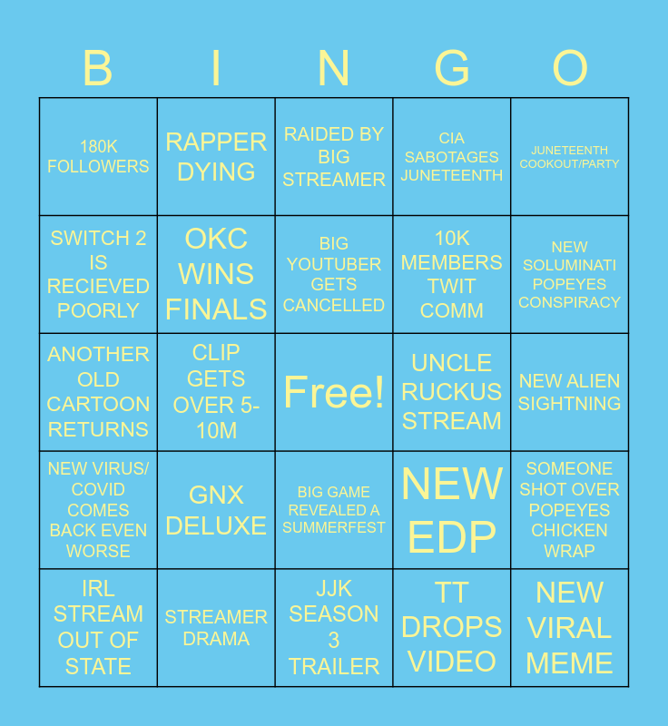 This bingo card has a free space and 24 words: GNX DELUXE, STREAMER DRAMA, BIG YOUTUBER GETS CANCELLED, IRL STREAM OUT OF STATE, JUNETEENTH COOKOUT/PARTY, 180K FOLLOWERS, SWITCH 2 IS RECIEVED POORLY, RAPPER DYING, UNCLE RUCKUS STREAM, BIG GAME REVEALED A SUMMERFEST, 10K MEMBERS TWIT COMM, ANOTHER OLD CARTOON RETURNS, NEW EDP, SOMEONE SHOT OVER POPEYES CHICKEN WRAP, OKC WINS FINALS, TT DROPS VIDEO, NEW ALIEN SIGHTNING, RAIDED BY BIG STREAMER, NEW SOLUMINATI POPEYES CONSPIRACY, CLIP GETS OVER 5-10M, NEW VIRAL MEME, NEW VIRUS/ COVID COMES BACK EVEN WORSE, CIA SABOTAGES JUNETEENTH and JJK SEASON 3 TRAILER.