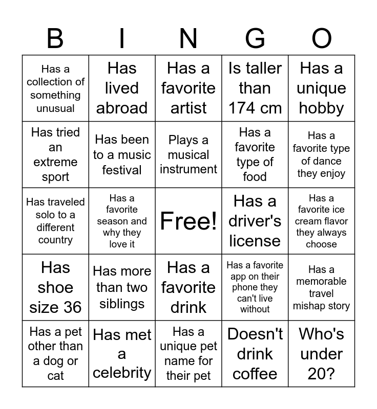 This bingo card has a free space and 24 words: Has more than two siblings, Has met a celebrity, Plays a musical instrument, Has a pet other than a dog or cat, Has a unique hobby, Has a collection of something unusual, Has tried an extreme sport, Has lived abroad, Has a driver's license, Has a favorite drink, Has a favorite type of food, Has traveled solo to a different country, Has a favorite app on their phone they can't live without, Has a memorable travel mishap story, Has been to a music festival, Doesn't drink coffee, Has a favorite ice cream flavor they always choose, Has a favorite artist, Has a favorite type of dance they enjoy, Has a favorite season and why they love it, Who's under 20?, Has shoe size 36, Is taller than 174 cm and Has a unique pet name for their pet.