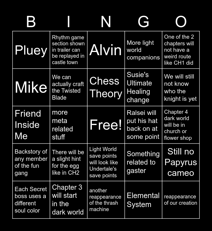 This bingo card has a free space and 24 words: There will be a slight hint for the egg like in CH2, Chapter 3 will start in the dark world, Chess Theory, Each Secret boss uses a different soul color, One of the 2 chapters will not have a weird route like CH1 did, Pluey, Mike, Rhythm game section shown in trailer can be replayed in castle town, Ralsei will put his hat back on at some point, Light World save points will look like Undertale's save points, Susie's Ultimate Healing change, Friend Inside Me, Something related to gaster, Still no Papyrus cameo, We can actually craft the Twisted Blade, Elemental System, Chapter 4 dark world will be in church or flower shop, Alvin, We will still not know who the knight is yet, more meta related stuff, reappearance of our creation, Backstory of any member of the fun gang, More light world companions and another reappearance of the thrash machine.