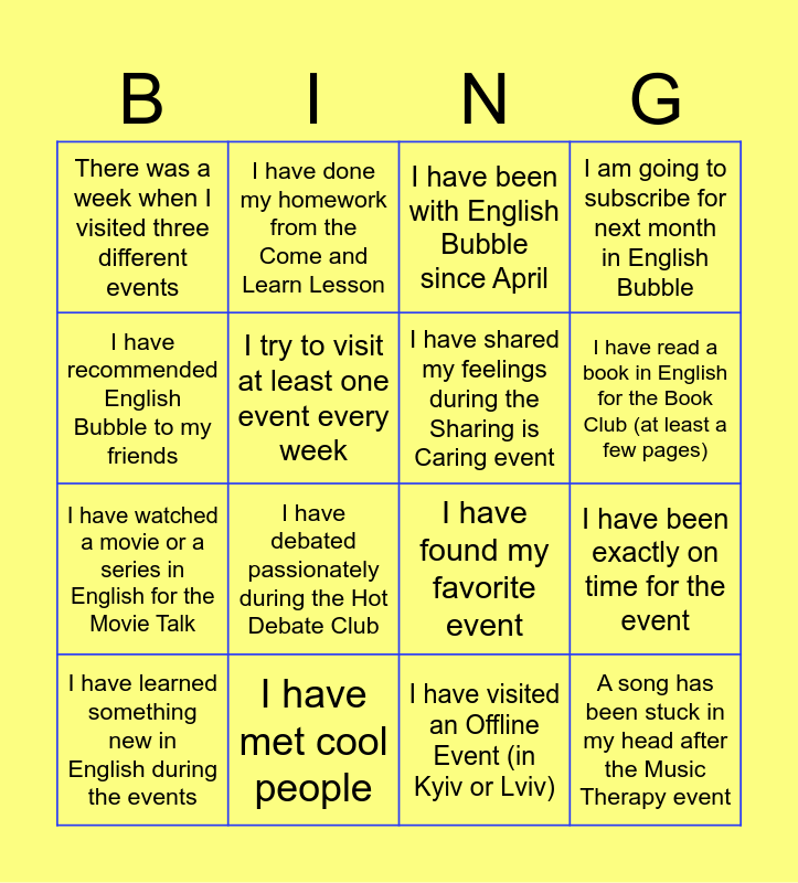 This bingo card has 17 words: I have learned something new in English during the events, I have met cool people, I have been with English Bubble since April, I am going to subscribe for next month in English Bubble, I have watched a movie or a series in English for the Movie Talk, I try to visit at least one event every week, I have found my favorite event, I have read a book in English for the Book Club (at least a few pages), I have recommended English Bubble to my friends, I have debated passionately during the Hot Debate Club, I have visited an Offline Event (in Kyiv or Lviv), I have been exactly on time for the event, There was a week when I visited three different events, I have done my homework from the Come and Learn Lesson, I have shared my feelings during the Sharing is Caring event, A song has been stuck in my head after the Music Therapy event and I have shared my feelings during the Sharing is Caring event.