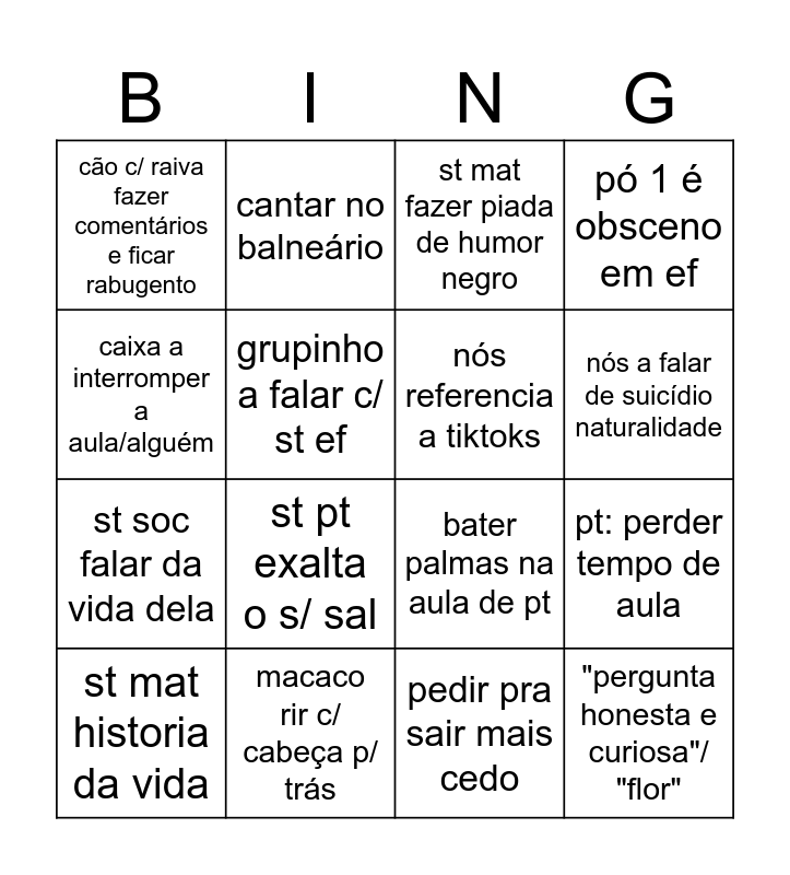 This bingo card has 16 words: macaco rir c/ cabeça p/ trás, pt: perder tempo de aula, st mat fazer piada de humor negro, cão c/ raiva fazer comentários e ficar rabugento, st soc falar da vida dela, cantar no balneário, bater palmas na aula de pt, pedir pra sair mais cedo, caixa a interromper a aula/alguém, grupinho a falar c/ st ef, st mat historia da vida, pó 1 é obsceno em ef, st pt exalta o s/ sal, nós a falar de suicídio naturalidade, nós referencia a tiktoks and "pergunta honesta e curiosa"/ "flor".