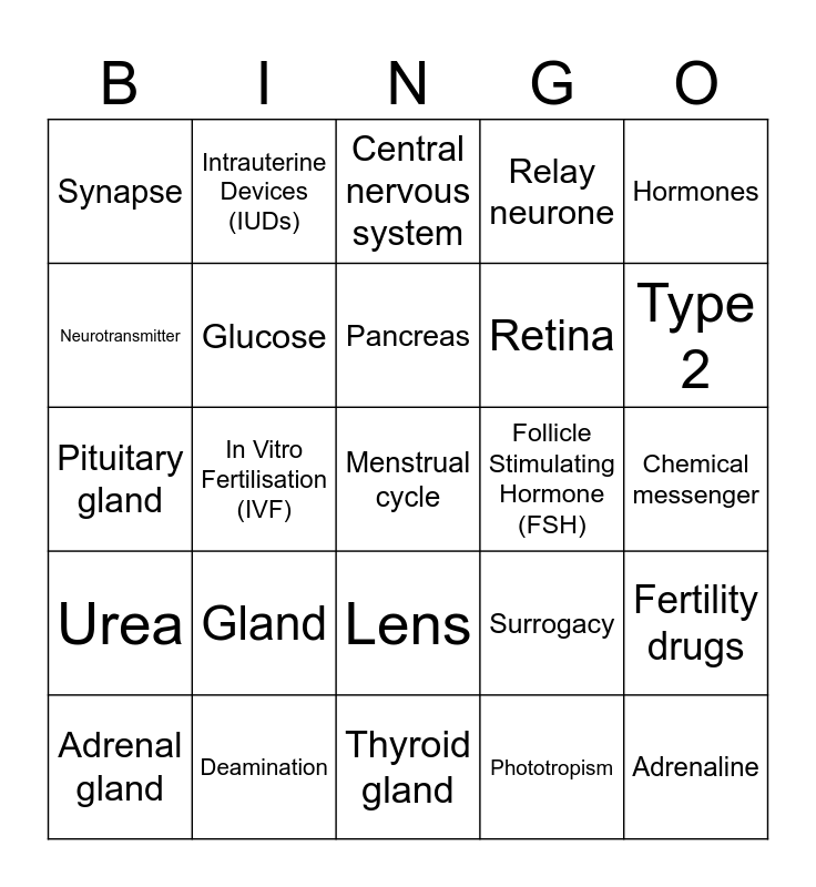 This bingo card has 80 words: Free!, Homeostasis, Central nervous system, Peripheral nervous system, Receptor, Effector, Stimulus, Neurone, Sensory neurone, Motor neurone, Reflex arc, Diffuse, Relay neurone, Synapse, Electrical impulse, Neurotransmitter, Endocrine, Gland, Blood, Chemical messenger, Secreted, Hormones, Pituitary gland, Pancreas, Glucose, Insulin, Glycogen, Glucagon, Negative feedback, Type 1, Type 2, Thyroxine, Thyroid gland, Adrenaline, Adrenal gland, Follicle Stimulating Hormone (FSH), Luteinising Hormone (LH), Oestrogen, Progesterone, Menstrual cycle, Ovulation, Follicle, Testosterone, Oral contraceptives, Diaphragm, Intrauterine Devices (IUDs), Barrier methods, Spermicide, Abstinence, Sterilisation, Fertility drugs, In Vitro Fertilisation (IVF), Surrogacy, Cerebral cortex, Medulla, Cerebellum, Spinal cord, Cornea, Iris, Lens, Retina, Accommodation, Hyperopia, Myopia, Thermoregulation, Hypothalamus, Vasoconstriction, Vasodilation, Filtration, Selective reabsorption, Urea, Deamination, Ammonia, Anti-diuretic hormone, Dialysis, Auxin, Phototropism, Geotropism, Gibberellin and Ethene.