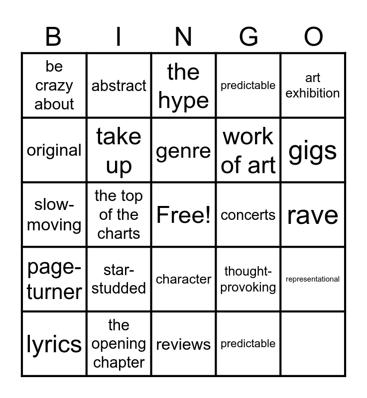 This bingo card has a free space and 24 words: page-turner, the opening chapter, character, thought-provoking, art exhibition, be crazy about, abstract, the hype, work of art, representational, original, take up, tunes, concerts, gigs, lyrics, the top of the charts, genre, predictable, rave, slow-moving, star-studded, reviews and predictable.