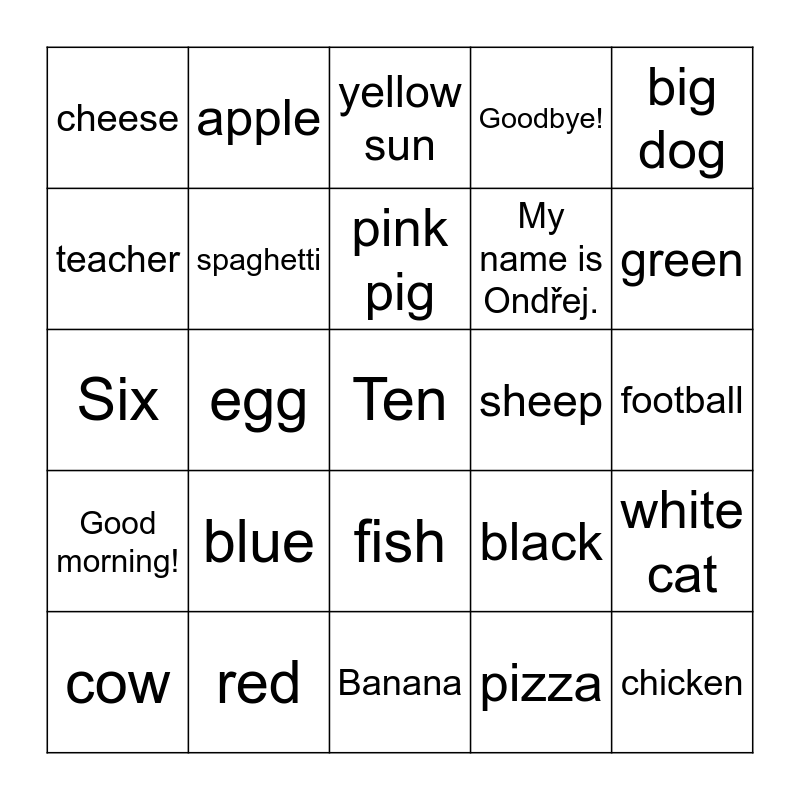 This bingo card has a free space and 24 words: blue, red, pink pig, cow, big dog, cheese, teacher, apple, sheep, fish, My name is Ondřej., Six, black, white cat, spaghetti, pizza, football, yellow sun, green, egg, chicken, Good morning!, Goodbye! and Banana.