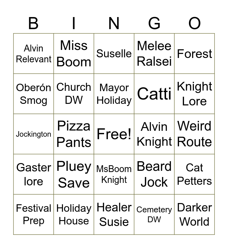 This bingo card has a free space and 24 words: Pluey Save, Holiday House, Mayor Holiday, Festival Prep, Forest, Alvin Relevant, Oberón Smog, Miss Boom, Alvin Knight, MsBoom Knight, Catti, Jockington, Beard Jock, Cat Petters, Church DW, Cemetery DW, Weird Route, Suselle, Knight Lore, Pizza Pants, Darker World, Gaster lore, Melee Ralsei and Healer Susie.
