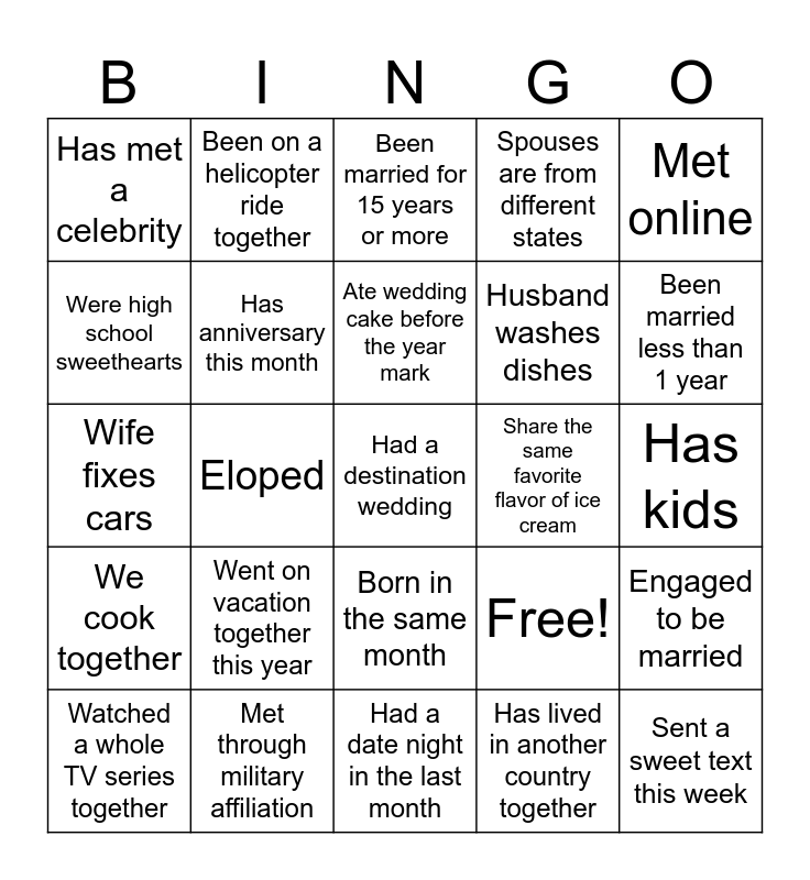 This bingo card has 25 words: Went on vacation together this year, Had a date night in the last month, Ate wedding cake before the year mark, Watched a whole TV series together, Met online, Has met a celebrity, Were high school sweethearts, Been on a helicopter ride together, Share the same favorite flavor of ice cream, Born in the same month, Husband washes dishes, Wife fixes cars, Free!, Engaged to be married, Has anniversary this month, Sent a sweet text this week, Has kids, Been married for 15 years or more, Been married less than 1 year, Eloped, Had a destination wedding, Met through military affiliation, We cook together, Spouses are from different states and Has lived in another country together.