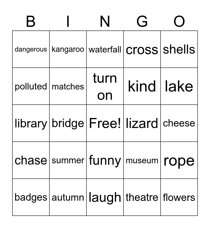 This bingo card has a free space and 24 words: summer, autumn, turn on, badges, shells, dangerous, polluted, kangaroo, lizard, funny, kind, library, museum, rope, matches, theatre, cheese, waterfall, lake, bridge, flowers, chase, cross and laugh.