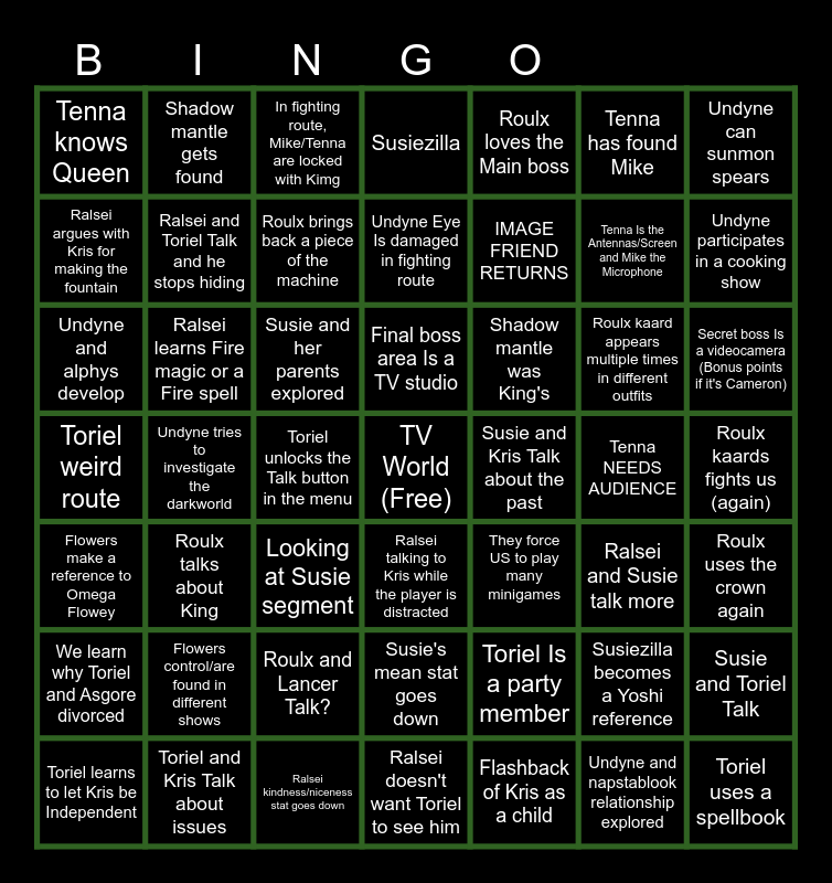 This bingo card has a free space and 48 words: Toriel Is a party member, Tenna Is the Antennas/Screen and Mike the Microphone, Ralsei doesn't want Toriel to see him, Undyne tries to investigate the darkworld, Susie and her parents explored, Roulx kaards fights us (again), Shadow mantle gets found, Toriel and Kris Talk about issues, Tenna has found Mike, Ralsei talking to Kris while the player is distracted, Undyne can sunmon spears, Susiezilla, Roulx kaard appears multiple times in different outfits, Shadow mantle was King's, We learn why Toriel and Asgore divorced, Tenna NEEDS AUDIENCE, Ralsei argues with Kris for making the fountain, Undyne participates in a cooking show, Susiezilla becomes a Yoshi reference, Roulx loves the Main boss, IMAGE FRIEND RETURNS, Toriel unlocks the Talk button in the menu, Tenna knows Queen, Ralsei and Toriel Talk and he stops hiding, Susie and Toriel Talk, Roulx brings back a piece of the machine, Secret boss Is a videocamera (Bonus points if it's Cameron), Toriel learns to let Kris be Independent, Final boss area Is a TV studio, Ralsei learns Fire magic or a Fire spell, Undyne and napstablook relationship explored, Susie and Kris Talk about the past, Roulx uses the crown again, Flowers control/are found in different shows, Toriel weird route, They force US to play many minigames, Ralsei and Susie talk more, Undyne and alphys develop, Looking at Susie segment, Roulx and Lancer Talk?, Flowers make a reference to Omega Flowey, Toriel uses a spellbook, In fighting route, Mike/Tenna are locked with Kimg, Ralsei kindness/niceness stat goes down, Undyne Eye Is damaged in fighting route, Susie's mean stat goes down, Roulx talks about King and Flashback of Kris as a child.