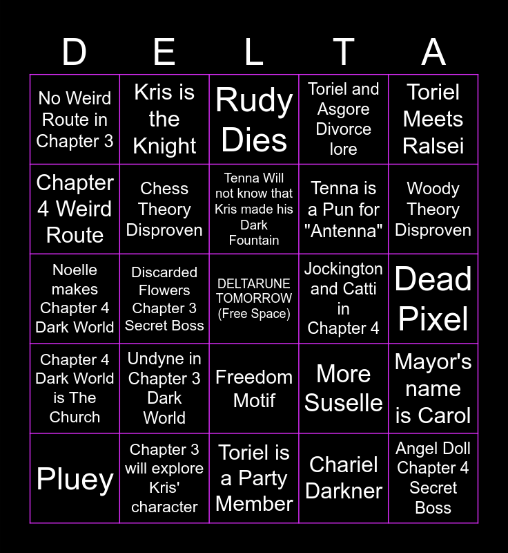 This bingo card has a free space and 24 words: Undyne in Chapter 3 Dark World, Chapter 3 will explore Kris' character, Tenna Will not know that Kris made his Dark Fountain, Pluey, Toriel Meets Ralsei, No Weird Route in Chapter 3, Chapter 4 Weird Route, Kris is the Knight, Jockington and Catti in Chapter 4, Freedom Motif, Tenna is a Pun for "Antenna", Noelle makes Chapter 4 Dark World, More Suselle, Mayor's name is Carol, Chess Theory Disproven, Chariel Darkner, Dead Pixel, Rudy Dies, Woody Theory Disproven, Discarded Flowers Chapter 3 Secret Boss, Angel Doll Chapter 4 Secret Boss, Chapter 4 Dark World is The Church, Toriel and Asgore Divorce lore and Toriel is a Party Member.