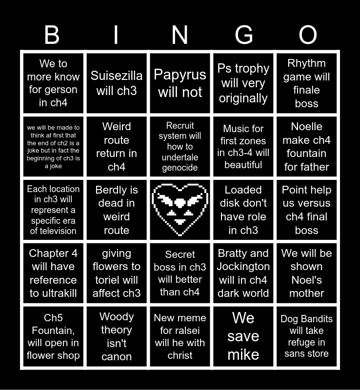 This bingo card has a free space and 24 words: giving flowers to toriel will affect ch3, Woody theory isn't canon, Recruit system will how to undertale genocide, Ch5 Fountain, will open in flower shop, Rhythm game will finale boss, We to more know for gerson in ch4, we will be made to think at first that the end of ch2 is a joke but in fact the beginning of ch3 is a joke, Suisezilla will ch3, Loaded disk don't have role in ch3, Secret boss in ch3 will better than ch4, Music for first zones in ch3-4 will beautiful, Each location in ch3 will represent a specific era of television, Bratty and Jockington will in ch4 dark world, We will be shown Noel's mother, Weird route return in ch4, We save mike, Point help us versus ch4 final boss, Papyrus will not, Noelle make ch4 fountain for father, Berdly is dead in weird route, Dog Bandits will take refuge in sans store, Chapter 4 will have reference to ultrakill, Ps trophy will very originally and New meme for ralsei will he with christ.