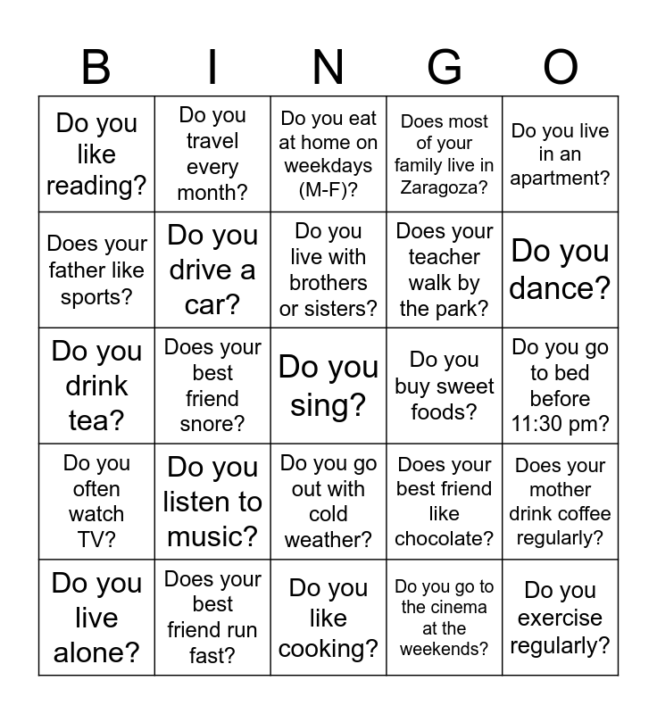 This bingo card has 25 words: Do you listen to music?, Do you like cooking?, Do you live with brothers or sisters?, Do you live alone?, Do you live in an apartment?, Do you like reading?, Does your father like sports?, Do you travel every month?, Do you buy sweet foods?, Do you go out with cold weather?, Does your teacher walk by the park?, Do you drink tea?, Does your best friend like chocolate?, Does your mother drink coffee regularly?, Do you drive a car?, Do you exercise regularly?, Do you go to bed before 11:30 pm?, Do you eat at home on weekdays (M-F)?, Do you dance?, Does your best friend snore?, Do you sing?, Does your best friend run fast?, Do you often watch TV?, Does most of your family live in Zaragoza? and Do you go to the cinema at the weekends?.