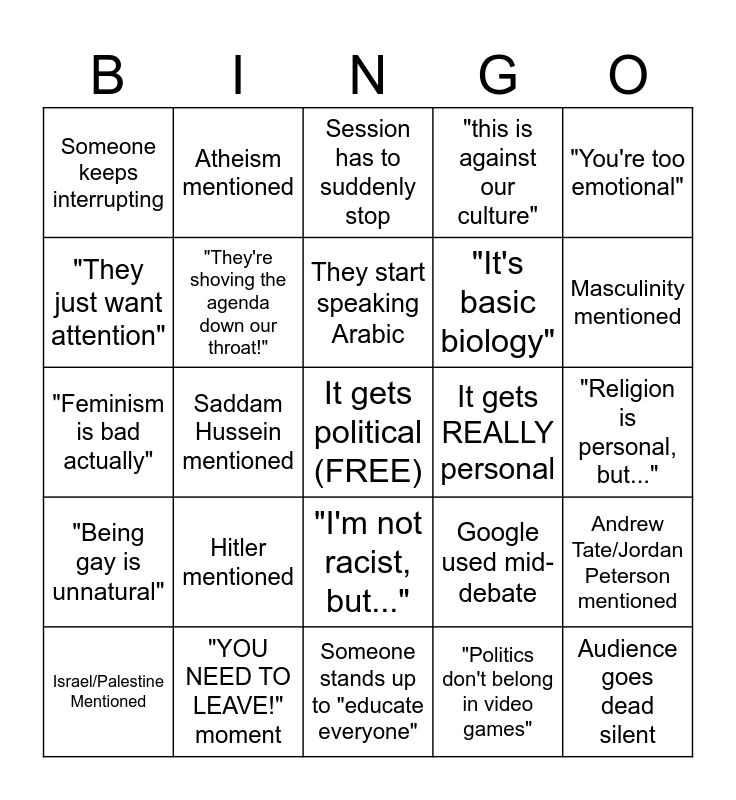 This bingo card has a free space and 24 words: Hitler mentioned, "YOU NEED TO LEAVE!" moment, They start speaking Arabic, Israel/Palestine Mentioned, "You're too emotional", Someone keeps interrupting, "They just want attention", Atheism mentioned, It gets REALLY personal, "I'm not racist, but...", "It's basic biology", "Feminism is bad actually", Google used mid-debate, Andrew Tate/Jordan Peterson mentioned, "They're shoving the agenda down our throat!", "Politics don't belong in video games", "Religion is personal, but...", Session has to suddenly stop, Masculinity mentioned, Saddam Hussein mentioned, Audience goes dead silent, "Being gay is unnatural", "this is against our culture" and Someone stands up to "educate everyone".