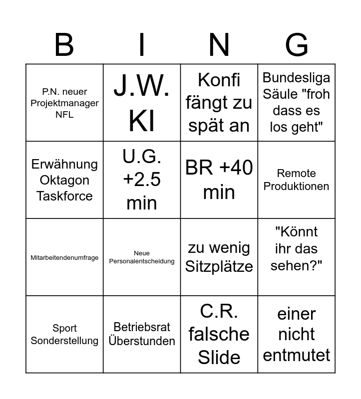 This bingo card has 16 words: Sport Sonderstellung, Betriebsrat Überstunden, Konfi fängt zu spät an, Bundesliga Säule "froh dass es los geht", Erwähnung Oktagon Taskforce, J.W. KI, zu wenig Sitzplätze, "Könnt ihr das sehen?", P.N. neuer Projektmanager NFL, U.G. +2.5 min, C.R. falsche Slide, Remote Produktionen, Mitarbeitendenumfrage, Neue Personalentscheidung, BR +40 min and einer nicht entmutet.