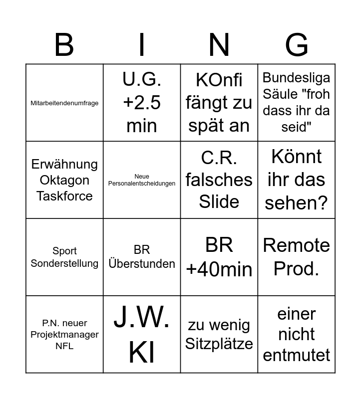 This bingo card has 16 words: P.N. neuer Projektmanager NFL, J.W. KI, KOnfi fängt zu spät an, Bundesliga Säule "froh dass ihr da seid", Erwähnung Oktagon Taskforce, U.G. +2.5 min, BR +40min, Remote Prod., Mitarbeitendenumfrage, Neue Personalentscheidungen, zu wenig Sitzplätze, Könnt ihr das sehen?, Sport Sonderstellung, BR Überstunden, C.R. falsches Slide and einer nicht entmutet.