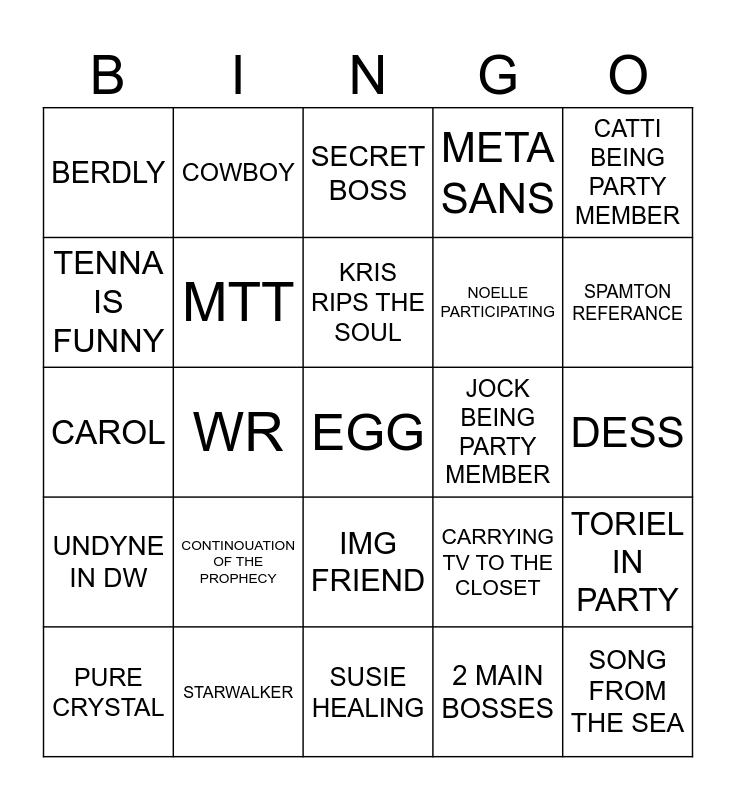 This bingo card has a free space and 24 words: CONTINOUATION OF THE PROPHECY, STARWALKER, KRIS RIPS THE SOUL, PURE CRYSTAL, CATTI BEING PARTY MEMBER, BERDLY, TENNA IS FUNNY, COWBOY, JOCK BEING PARTY MEMBER, IMG FRIEND, NOELLE PARTICIPATING, CAROL, CARRYING TV TO THE CLOSET, TORIEL IN PARTY, MTT, 2 MAIN BOSSES, DESS, SECRET BOSS, SPAMTON REFERANCE, WR, SONG FROM THE SEA, UNDYNE IN DW, META SANS and SUSIE HEALING.