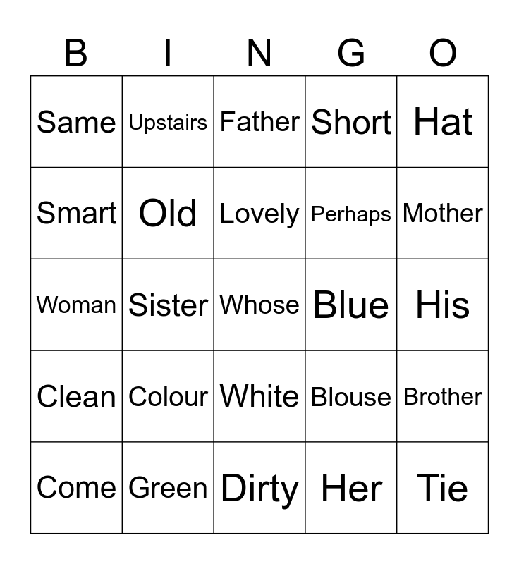 This bingo card has a free space and 24 words: Colour, Green, Lovely, Come, Hat, Same, Smart, Upstairs, Blue, White, Perhaps, Woman, Blouse, Brother, Old, Her, His, Father, Mother, Sister, Tie, Clean, Short and Dirty.