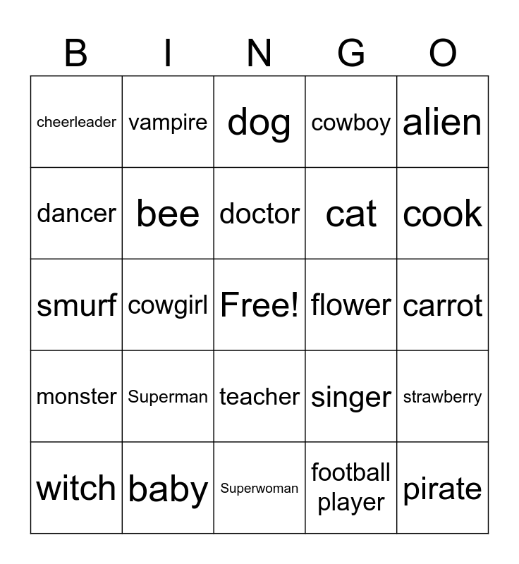 This bingo card has a free space and 24 words: witch, Superman, doctor, football player, alien, cheerleader, vampire, dog, flower, carrot, smurf, bee, singer, strawberry, dancer, baby, Superwoman, cowboy, cook, monster, cowgirl, teacher, cat and pirate.