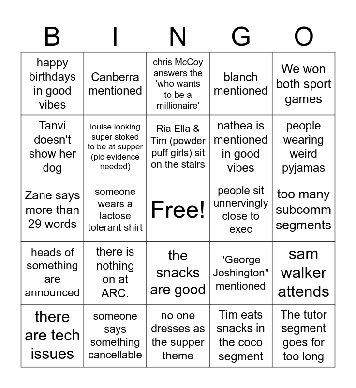 This bingo card has a free space and 41 words: Ria gets us in trouble segment, Zane says more than 29 words, exec shushes people, louise looking super stoked to be at supper (pic evidence needed), someone says something cancellable, the snacks are good, Ria Ella & Tim (powder puff girls) sit on the stairs, Zane and Louise cut off the sport chant, We won both sport games, heads of something are announced, someone wears a lactose tolerant shirt, blanch mentioned, The tutor segment goes for too long, too many subcomm segments, people sit unnervingly close to exec, there is nothing on at ARC., chop is mentioned, happy birthdays in good vibes, socials announce a sick party, chris McCoy answers the 'who wants to be a millionaire', sam walker attends, the exec speaker doesn't work, no one dresses as the supper theme, nathea is mentioned in good vibes, matt does his devilish grin, not enough supper snacks, Tim eats snacks in the coco segment, Charles rocks up late for supper with his cello, people wearing weird pyjamas, Ryan mentions gambling, runsoc does a segment, Canberra mentioned, there are tech issues, Tim gets distracted while doing slides, "George Joshington" mentioned, Tanvi doesn't show her dog, matt explains the benefits of the feedback form, supper starts 10 mins late, an exec member pretends to be another exec member, Ria eats (both metaphorically or uber eats will suffice) and take a photo of batty maines.