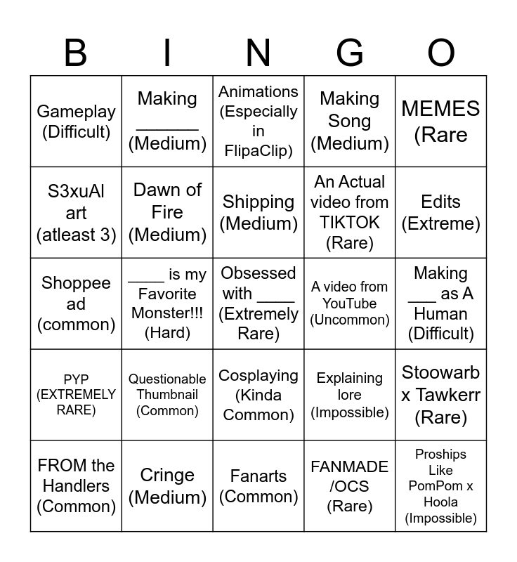 This bingo card has 25 words: Questionable Thumbnail (Common), Fanarts (Common), Shipping (Medium), FROM the Handlers (Common), MEMES (Rare, Gameplay (Difficult), S3xuAl art (atleast 3), Making ______ (Medium), A video from YouTube (Uncommon), Cosplaying (Kinda Common), An Actual video from TIKTOK (Rare), Shoppee ad (common), Explaining lore (Impossible), Stoowarb x Tawkerr (Rare), Dawn of Fire (Medium), Proships Like PomPom x Hoola (Impossible), Making ___ as A Human (Difficult), Animations (Especially in FlipaClip), Edits (Extreme), ____ is my Favorite Monster!!! (Hard), Obsessed with ____ (Extremely Rare), Cringe (Medium), PYP (EXTREMELY RARE), Making Song (Medium) and FANMADE /OCS (Rare).