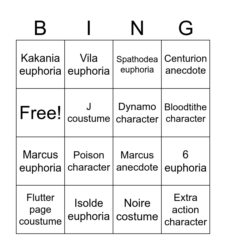 This bingo card has 16 words: Isolde euphoria, 6 euphoria, Spathodea euphoria, Kakania euphoria, Marcus euphoria, Vila euphoria, Marcus anecdote, Noire costume, Free!, J coustume, Flutter page coustume, Centurion anecdote, Poison character, Bloodtithe character, Dynamo character and Extra action character.