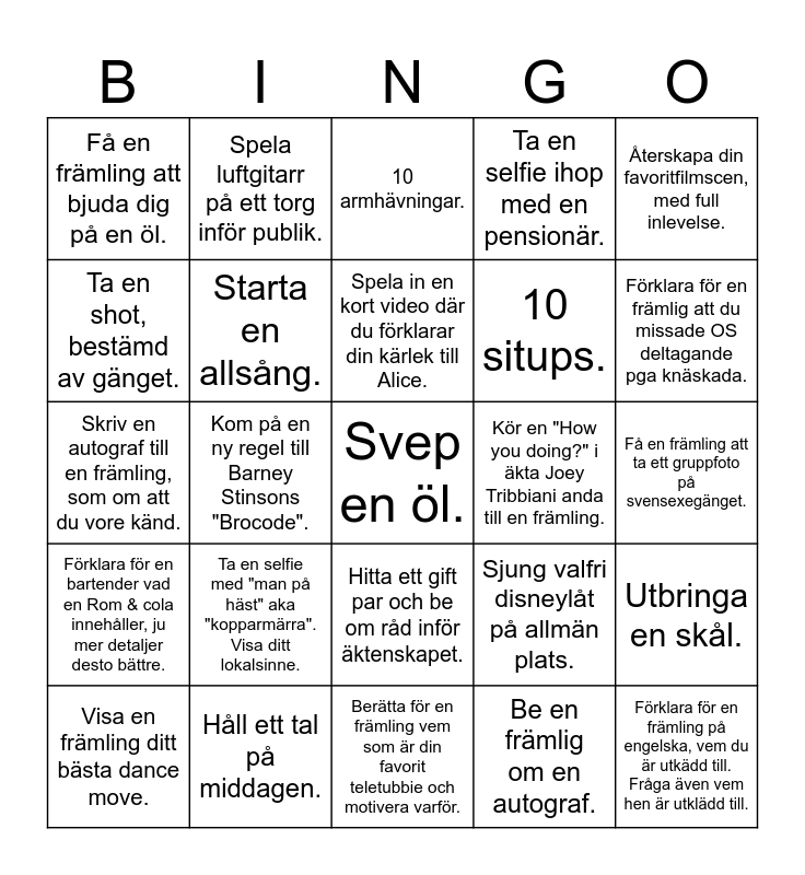 This bingo card has a free space and 24 words: Visa en främling ditt bästa dance move., Ta en selfie med "man på häst" aka "kopparmärra". Visa ditt lokalsinne., Spela in en kort video där du förklarar din kärlek till Alice., Be en främlig om en autograf., Återskapa din favoritfilmscen, med full inlevelse., Få en främling att bjuda dig på en öl., Spela luftgitarr på ett torg inför publik., 10 armhävningar., Kör en "How you doing?" i äkta Joey Tribbiani anda till en främling., Få en främling att ta ett gruppfoto på svensexegänget., Skriv en autograf till en främling, som om att du vore känd., Starta en allsång., Sjung valfri disneylåt på allmän plats., Utbringa en skål., Ta en shot, bestämd av gänget., Håll ett tal på middagen., Berätta för en främling vem som är din favorit teletubbie och motivera varför., Ta en selfie ihop med en pensionär., Förklara för en främlig att du missade OS deltagande pga knäskada., Förklara för en bartender vad en Rom & cola innehåller, ju mer detaljer desto bättre., Kom på en ny regel till Barney Stinsons "Brocode"., Hitta ett gift par och be om råd inför äktenskapet., 10 situps. and Förklara för en främling på engelska, vem du är utkädd till. Fråga även vem hen är utklädd till..
