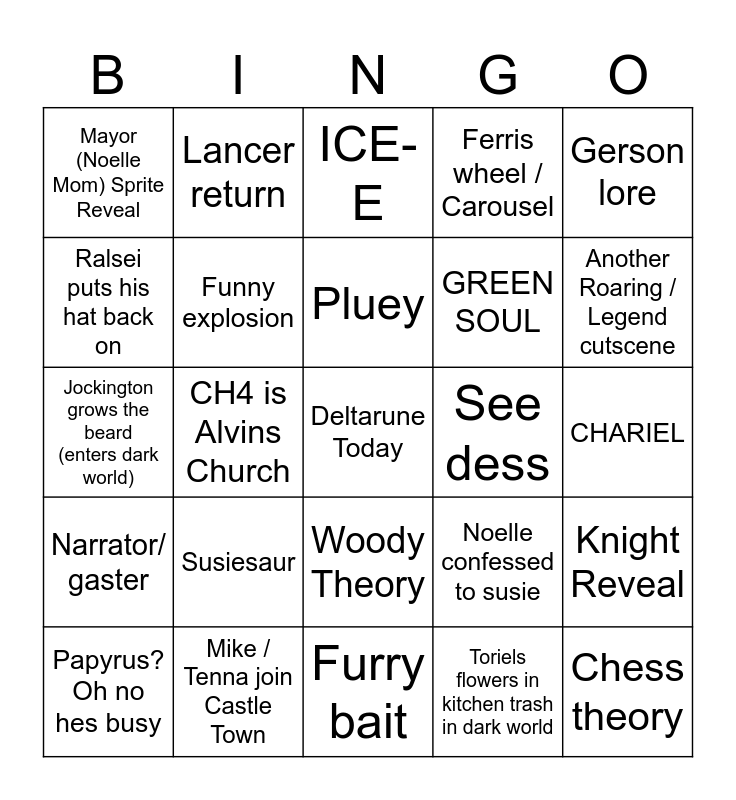 This bingo card has a free space and 24 words: Susiesaur, Mike / Tenna join Castle Town, Pluey, Papyrus? Oh no hes busy, Gerson lore, Mayor (Noelle Mom) Sprite Reveal, Ralsei puts his hat back on, Lancer return, See dess, Woody Theory, GREEN SOUL, Jockington grows the beard (enters dark world), Noelle confessed to susie, Knight Reveal, Funny explosion, Toriels flowers in kitchen trash in dark world, CHARIEL, ICE-E, Another Roaring / Legend cutscene, CH4 is Alvins Church, Chess theory, Narrator/ gaster, Ferris wheel / Carousel and Furry bait.