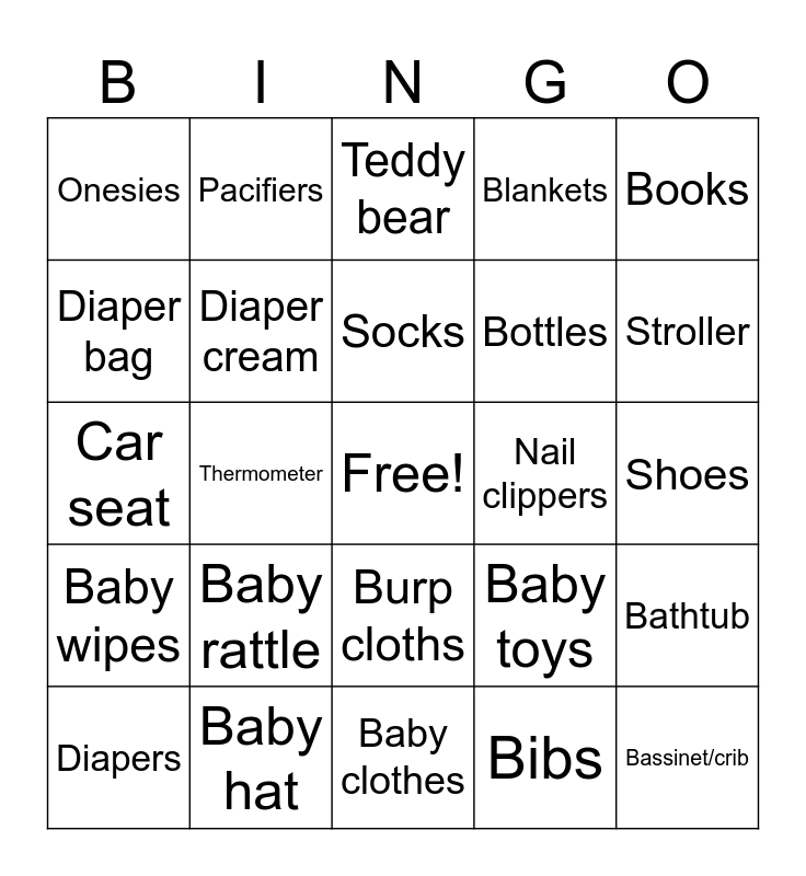 This bingo card has a free space and 24 words: Baby rattle, Baby hat, Socks, Diapers, Books, Onesies, Diaper bag, Pacifiers, Nail clippers, Burp cloths, Bottles, Car seat, Baby toys, Bathtub, Diaper cream, Bibs, Shoes, Teddy bear, Stroller, Thermometer, Bassinet/crib, Baby wipes, Blankets and Baby clothes.