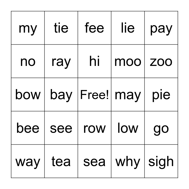 This bingo card has a free space and 24 words: see, tea, hi, way, pay, my, no, tie, may, row, moo, bow, low, go, ray, why, pie, fee, zoo, bay, sigh, bee, lie and sea.