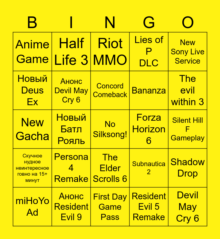 This bingo card has a free space and 24 words: Persona 4 Remake, Анонс Resident Evil 9, Concord Comeback, miHoYo Ad, New Sony Live Service, Anime Game, Новый Deus Ex, Half Life 3, Forza Horizon 6, The Elder Scrolls 6, Bananza, New Gacha, Subnautica 2, Shadow Drop, Анонс Devil May Cry 6, Resident Evil 5 Remake, Silent Hill F Gameplay, Riot MMO, The evil within 3, Новый Батл Рояль, Devil May Cry 6, Скучное нудное неинтересное говно на 15+ минут, Lies of P DLC and First Day Game Pass.