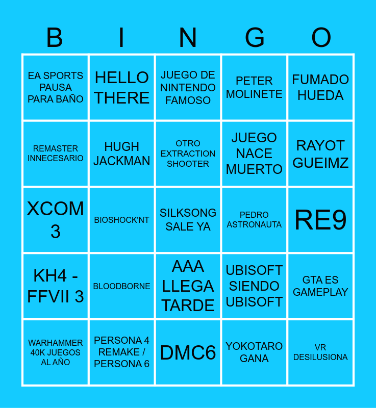 This bingo card has a free space and 24 words: BLOODBORNE, PERSONA 4 REMAKE / PERSONA 6, OTRO EXTRACTION SHOOTER, WARHAMMER 40K JUEGOS AL AÑO, FUMADO HUEDA, EA SPORTS PAUSA PARA BAÑO, REMASTER INNECESARIO, HELLO THERE, PEDRO ASTRONAUTA, AAA LLEGA TARDE, JUEGO NACE MUERTO, XCOM 3, UBISOFT SIENDO UBISOFT, GTA ES GAMEPLAY, HUGH JACKMAN, YOKOTARO GANA, RE9, JUEGO DE NINTENDO FAMOSO, RAYOT GUEIMZ, BIOSHOCK'NT, VR DESILUSIONA, KH4 - FFVII 3, PETER MOLINETE and DMC6.