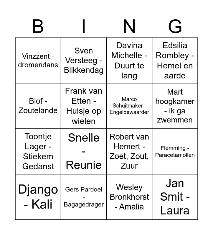 This bingo card has 36 words: Frans Bauer - Heb je even voor mij, Samuel Welten - echte liefde is te koop, Andre Hazes - de vlieger, Marco Schuitmaker - Engelbewaarder, Nielson - sexy als ik dans, Jan Smit - Laura, Mart hoogkamer - ik ga zwemmen, Acda en de Munnik - Morgen wordt fantastisch, Blof - Zoutelande, Wolter Kroes - ik heb de hele nacht liggen dromen, Flemming - Paracetamollen, Edsilia Rombley - Hemel en aarde, Pommeline Thijssen - Atlas, Gers Pardoel - Bagagedrager, Snelle - Reunie, Vinzzent - dromendans, Nielson - ijskoud, Doe Maar - Sinds een dag of twee, Django - Kali, Davina Michelle - Duurt te lang, Wesley Bronkhorst - Amalia, Abel - Onderweg, Ademnood - Linda Roos en Jessica, Nick en Simon - De Soldaat, Nielson & Miss Montreal - Hoe, Sven Versteeg - Blikkendag, Robert van Hemert - Zoet, Zout, Zuur, Goldwind - Noodgeval, Toontje Lager - Stiekem Gedanst, Frank van Etten - Huisje op wielen, Kriss Kross Amsterdam - Adrenaline, Guus Meeuwis - Geef mij je angst, Brainpower - Dansplaat, Guus Meeuwis - Kdeng Kdeng, Diggy Dex & Eva derovere - Slaap lekker (fantastig toch) and Rene Karst - Atje voor de sfeer.