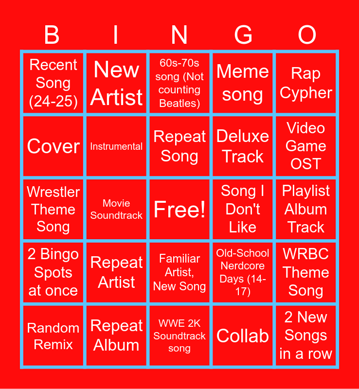 This bingo card has a free space and 24 words: Repeat Artist, Repeat Album, Repeat Song, Random Remix, Rap Cypher, Recent Song (24-25), Cover, New Artist, Song I Don't Like, Familiar Artist, New Song, Deluxe Track, Wrestler Theme Song, Old-School Nerdcore Days (14-17), WRBC Theme Song, Instrumental, Collab, Playlist Album Track, 60s-70s song (Not counting Beatles), Video Game OST, Movie Soundtrack, 2 New Songs in a row, 2 Bingo Spots at once, Meme song and WWE 2K Soundtrack song.