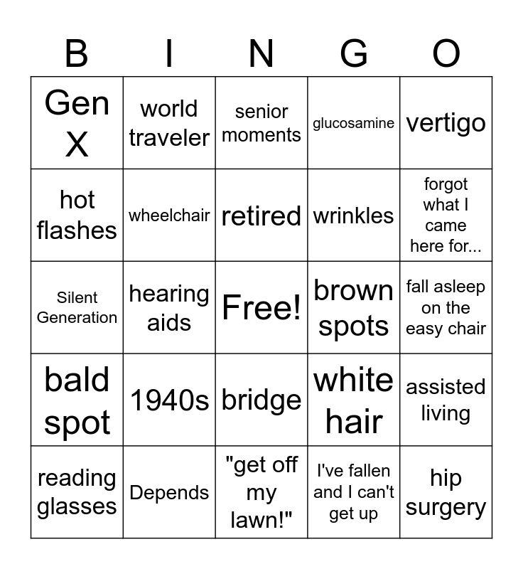 This bingo card has a free space and 54 words: 1970s, bald spot, back pain, large print, bridge, laxatives, glucosamine, joint pain, hot flashes, ED, Gen X, Baby boomer, Depends, reading glasses, nursing home, "get off my lawn!", hip surgery, wrinkles, knee surgery, fall asleep on the easy chair, white hair, house coat, brown spots, vertigo, waving to passersby, world traveler, senior shuffle, special shoes, thinning hairs, I've fallen and I can't get up, bucket list, ginko biloba, geriatric, old fogey, senior moments, 1930s, Silent Generation, assisted living, hemoroids, wheelchair, cane, walker, rocking chair, 1960s, 1940s, 1950s, grey hair, born in June, retired, hearing aids, forgot what I came here for..., denture cream, More than 10 pills a day and back pain.