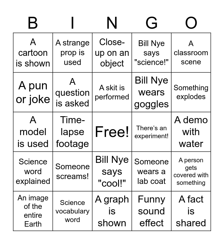 This bingo card has a free space and 30 words: Science vocabulary word, "Did you know...?", Time-lapse footage, Sound effect: boom!, A cartoon is shown, Close-up on an object, A question is asked, Bill Nye says "cool!", There’s an experiment!, A graph is shown, A demo with water, A fact is shared, Funny sound effect, An animal appears, Something explodes, Slow-motion video, Someone wears a lab coat, Science word explained, Someone screams!, A classroom scene, A model is used, A close-up of a machine, A strange prop is used, Bill Nye wears goggles, A pun or joke, Bill Nye says "science!", A person gets covered with something, An image of the entire Earth, A skit is performed and Something is thrown or dropped.