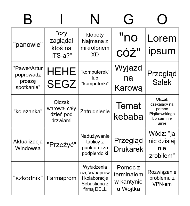 This bingo card has 25 words: "Przeżyć", Wyłudzenia części/napraw i kolaboracje Sebastiana z firmą DELL, "komputerek" lub "komputerki", "szkodnik", Lorem ipsum, "panowie", "Paweł/Artur poprowadź proszę spotkanie", "czy zaglądał ktoś na ITS-a?", Temat kebaba, Nadużywanie tablicy z punktami za podpierdolki, Wyjazd na Karową, "koleżanka", Przegląd Drukarek, Wódz: "ja nic dzisiaj nie zrobiłem", HEHE SEGZ, Rozwiązanie problemu z VPN-em, Olczak czekający na pomoc Piątkowskiego bo sam nie umie, kłopoty Najmana z mikrofonem XD, Przegląd Salek, Olczak warował cały dzień pod drzwiami, Zatrudnienie, Farmaprom, Aktualizacja Windowsa, "no cóż" and Pomoc z terminalem w kantynie u Wojtka.