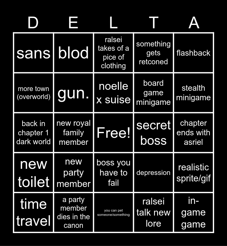 This bingo card has a free space and 24 words: new party member, a party member dies in the canon, noelle x suise, time travel, flashback, sans, more town (overworld), blod, secret boss, boss you have to fail, board game minigame, back in chapter 1 dark world, depression, realistic sprite/gif, gun., ralsei talk new lore, chapter ends with asriel, ralsei takes of a pice of clothing, stealth minigame, new royal family member, in-game game, new toilet, something gets retconed and you can pet someone/something.