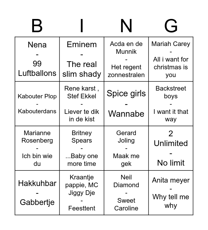 This bingo card has 36 words: Snollebollekes - Links Rechts, Aqua - Barbie girl, Donnie & Rene Froger - Bon gepakt, Spice girls - Wannabe, Guus Meeuwis - Brabant, Anita meyer - Why tell me why, Backstreet boys - I want it that way, ABBA - Dancing Queen, Kabouter Plop - Kabouterdans, Vengaboys - We're going to ibiza, 2 Unlimited - No limit, Mariah Carey - All i want for christmas is you, Toto - Africa, Kraantje pappie, MC Jiggy Dje - Feesttent, Britney Spears - ...Baby one more time, Nena - 99 Luftballons, K3 - De 3 Biggetjes, Queen - I want to break Free, Hakkuhbar - Gabbertje, Acda en de Munnik - Het regent zonnestralen, Neil Diamond - Sweet Caroline, Los Del Rio - Macarena, Village People - Y.M.C.A, Donnie, Frans Duijts - Frans Duits, Normaal - Oerend Hard, Eminem - The real slim shady, Gerard Joling - Maak me gek, Wham! - Wake me up before you go go, Marianne Rosenberg - Ich bin wie du, Rene karst , Stef Ekkel - Liever te dik in de kist, Kylie Minoque & Jason Donovan - Especially For You, Black eyed Peas - Let's get it started, Rednex - Cotton eye Joe, Vengaboys - Boom boom boom boom!!, Rikky Martin - Livin' la vida loca and Shakira - Waka Waka.