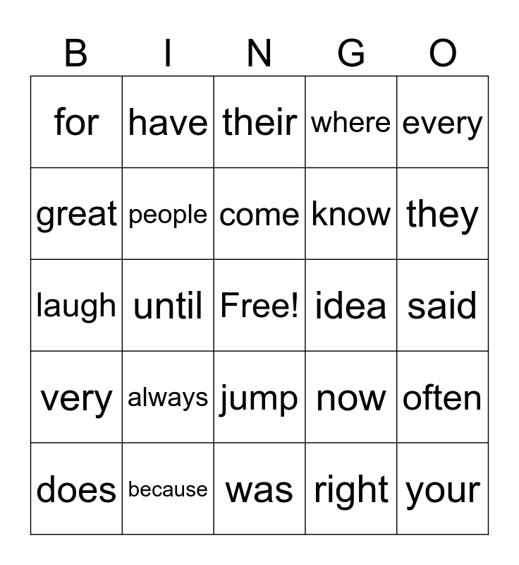 This bingo card has a free space and 24 words: always, because, come, does, every, for, great, have, idea, jump, know, laugh, now, often, people, right, said, their, they, until, your, very, where and was.