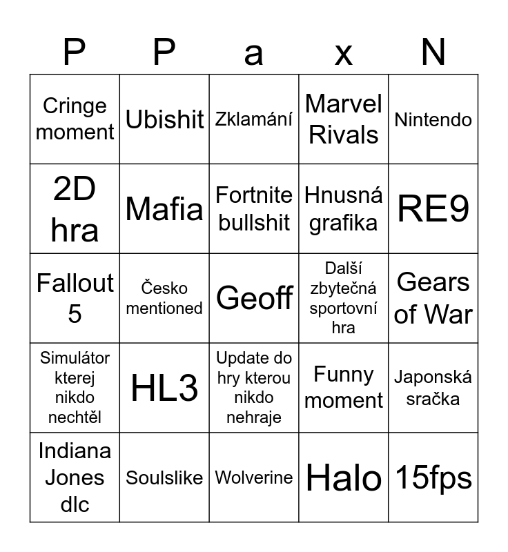 This bingo card has a free space and 24 words: Indiana Jones dlc, HL3, Fortnite bullshit, Halo, Nintendo, Cringe moment, Ubishit, Zklamání, Další zbytečná sportovní hra, Gears of War, Fallout 5, Mafia, Funny moment, Japonská sračka, 2D hra, Soulslike, Wolverine, Marvel Rivals, RE9, Simulátor kterej nikdo nechtěl, Česko mentioned, Update do hry kterou nikdo nehraje, Hnusná grafika and 15fps.