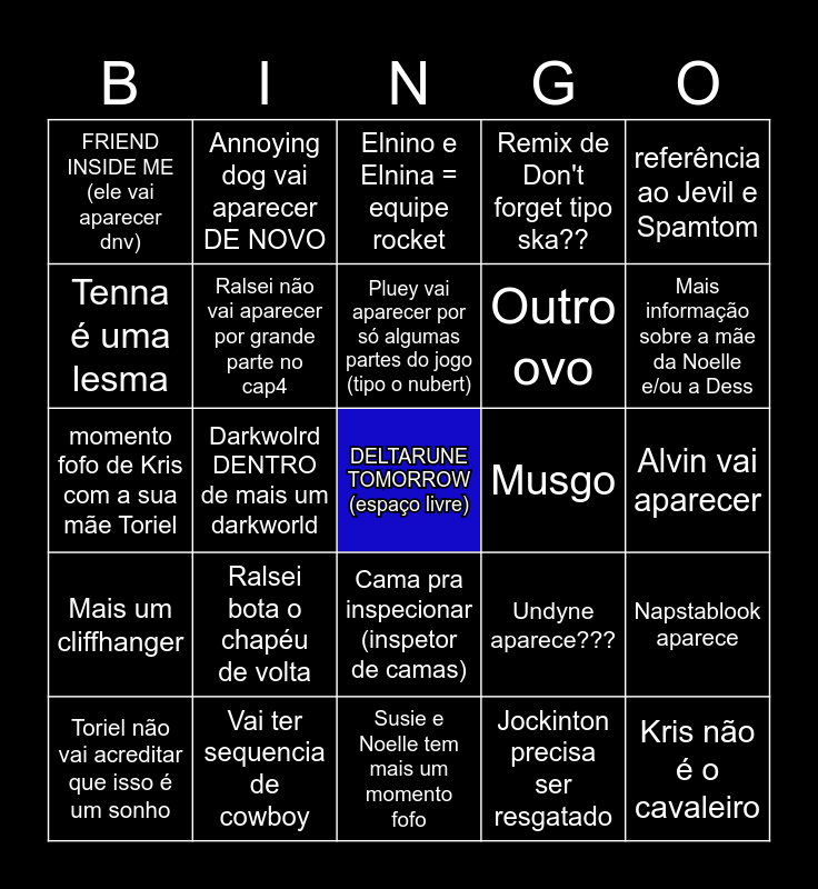 This bingo card has a free space and 24 words: Ralsei bota o chapéu de volta, Vai ter sequencia de cowboy, Pluey vai aparecer por só algumas partes do jogo (tipo o nubert), Toriel não vai acreditar que isso é um sonho, referência ao Jevil e Spamtom, FRIEND INSIDE ME (ele vai aparecer dnv), Tenna é uma lesma, Annoying dog vai aparecer DE NOVO, Musgo, Cama pra inspecionar (inspetor de camas), Outro ovo, momento fofo de Kris com a sua mãe Toriel, Undyne aparece???, Napstablook aparece, Ralsei não vai aparecer por grande parte no cap4, Jockinton precisa ser resgatado, Alvin vai aparecer, Elnino e Elnina = equipe rocket, Mais informação sobre a mãe da Noelle e/ou a Dess, Darkwolrd DENTRO de mais um darkworld, Kris não é o cavaleiro, Mais um cliffhanger, Remix de Don't forget tipo ska?? and Susie e Noelle tem mais um momento fofo.