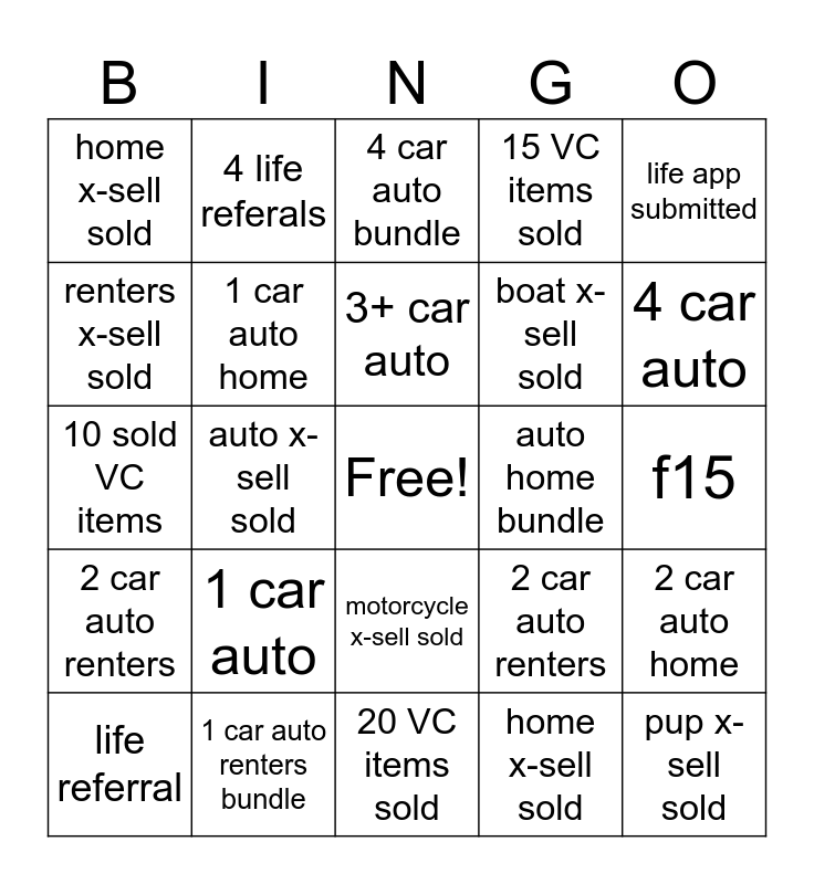 This bingo card has a free space and 24 words: 1 car auto, 1 car auto renters bundle, 3+ car auto, life referral, life app submitted, home x-sell sold, renters x-sell sold, 4 life referals, auto home bundle, motorcycle x-sell sold, boat x-sell sold, 10 sold VC items, 2 car auto renters, 2 car auto home, 1 car auto home, home x-sell sold, f15, 4 car auto bundle, 4 car auto, auto x-sell sold, pup x-sell sold, 2 car auto renters, 15 VC items sold and 20 VC items sold.