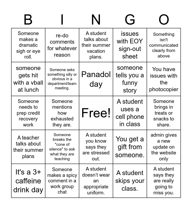 This bingo card has a free space and 30 words: Someone makes a spicy comment in a work group chat, Someone admits to crying (happy or sad tears), Someone mentions how exhausted they are., A teacher gives a count-down to the end of school., Someone makes a dramatic sigh or eye roll., A student talks about their summer vacation plans., Someone asks something silly or obvious in a department/team meeting., A student you know says they are stressed out., A student uses a cell phone in class, A student doesn’t wear an appropriate uniform., Someone brings in treats or snacks to share., A student says they are really going to miss you., A student skips your class., Tech fails, You have issues with the photocopier, You have to do an on-call or exam coverage., You get a gift from someone., A teacher talks about their summer plans, Someone breaks the "cone of silence" to ask what they are teaching, Something isn't communicated clearly from above, Someone needs to prep credit recovery work, someone missing grading or comment deadline, re-do comments for whatever reason, someone tells you a funny story, someone gets hit with a vball at lunch, issues with EOY sign-out sheet, admin gives a new update on the website only, It's a 3+ caffeine drink day, Panadol day and A student openly breaks a school rule.