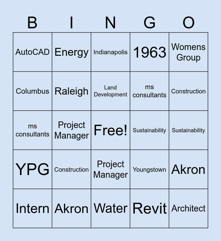 This bingo card has a free space and 52 words: Engineer, Architect, Building Systems, Water, Construction, Transportation, Energy, 1963, Columbus, Cleveland, Raleigh, Indy, Akron, Youngstown, Pittsburgh, Planners, Land Development, Sustainability, YPG, Womens Group, Project Manager, Revit, AutoCAD, ms consultants, Engineer, Architect, Building Systems, Water, Construction, Transportation, Energy, 1963, Columbus, Cleveland, Raleigh, Indianapolis, Akron, Youngstown, Pittsburgh, Planners, Land Development, Sustainability, YPG, Womens Group, Project Manager, Revit, AutoCAD, ms consultants, Teams call, Time Sheet, Intern and Outlook.